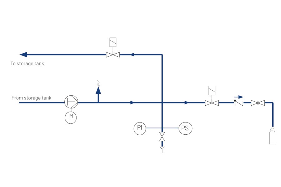 Pentair's Cylinder Filling Unit - CFU consists of a high-pressure cylinder filling pump with a capacity of 600 kg/hr connected to the CO2 storage tank in a by-pass system.