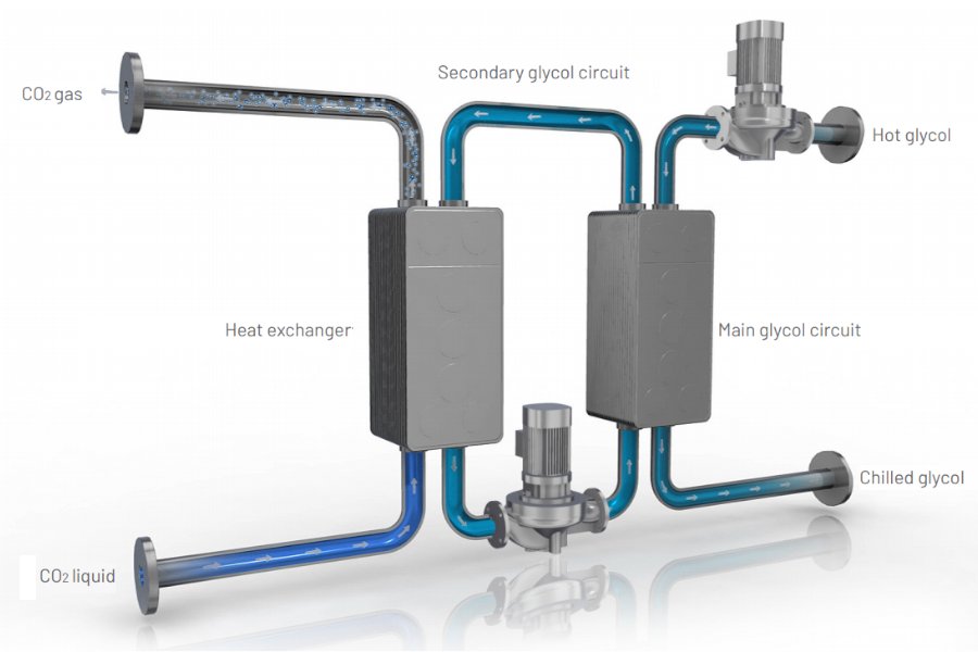 The innovative heat exchange system, ReVap, uses the cooling capacity of stored liquid CO2 to chill glycol. The transfer of heat between glycol and liquid CO2 subsequently raises the temperature of CO2 to its evaporation point.